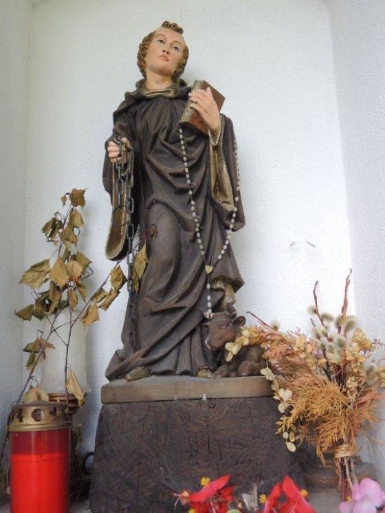 Im Inneren des Bauwerkes steht eine geschnitzte Leonhard-Statue mit den Attributen des Heiligen: einer Kette, eines faltenreichen, weitärmeligen Überkleid als Abt und eines Ochsen, der ihm zu Füßen liegt. Der heilige Leonhard ist der Schutzherr der Gefangenen sowie der Patron der Landwirtschaft und des Viehs. Sein Gedenktag wird am 6. November gefeiert.