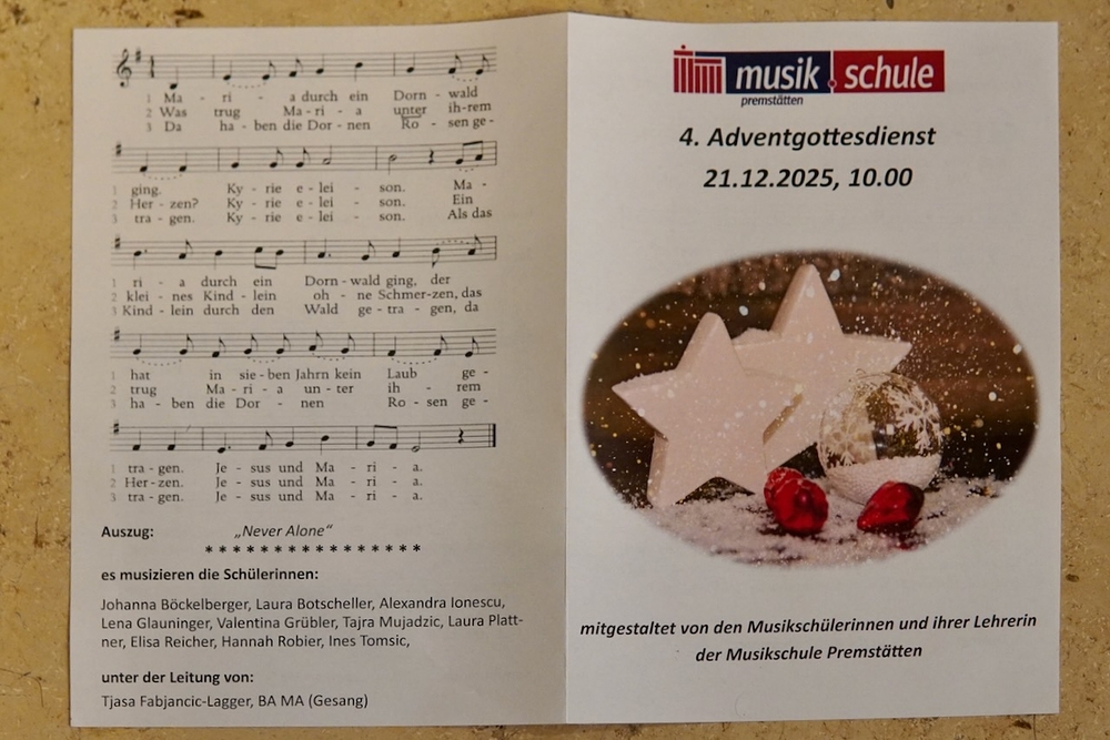 Die musikalische Gestaltung lag wieder in den Händen der Musikerinnen und Musiker der Musikschule Premstätten. Orgelmusik und Holzbläserensembles erfüllten die Kirche mit adventlichen Klängen und erfreuten alle Mitfeiernden.