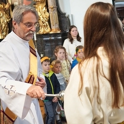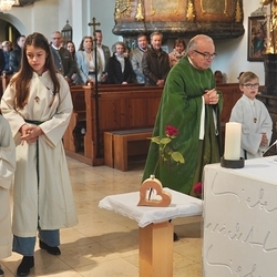 Voll Dankbarkeit und Freude feierten wir das diesjährige Erntedankfest in unserer mit großen und kleinen Leuten gut gefüllten Kirche. Vikar Norbert Glaser zelebrierte die heilige Messe, assistiert von Diakon Michi Zepf und sieben tüchtigen Minis.