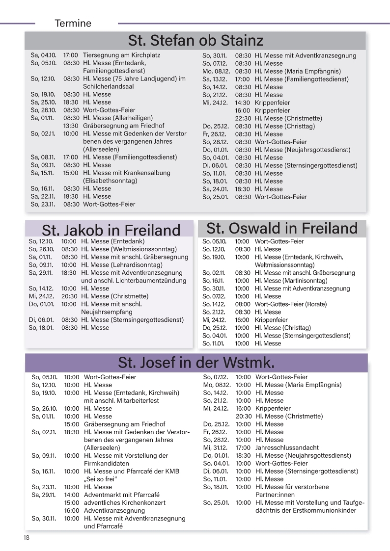 Bad Gams; Deutschlandsberg; Frauental; Glashütten; Maria Osterwitz; Stainz; St. Jakob in Freiland; St. Josef in der Weststeiermark; St. Oswald in Freiland; St. Stefan ob Stainz; Trahütten